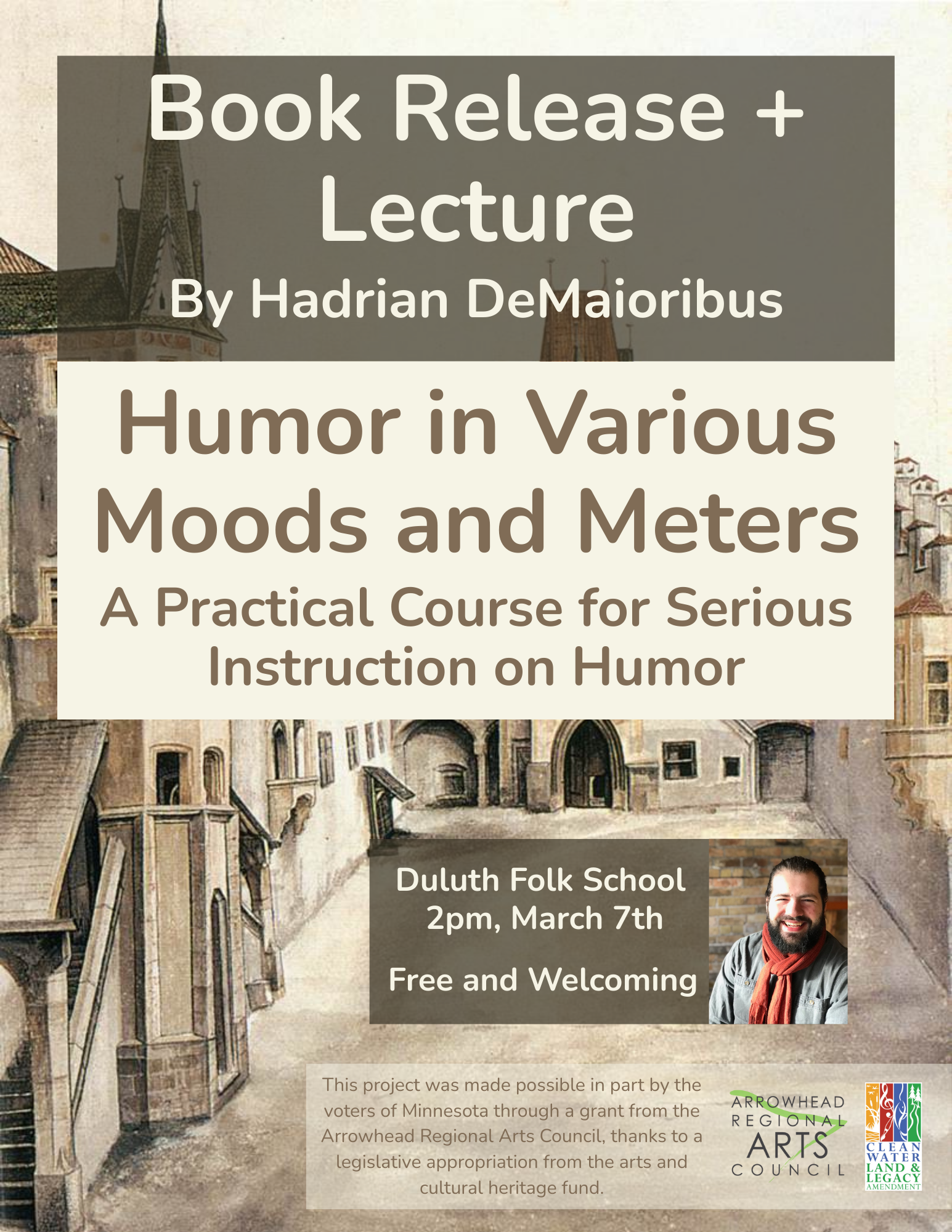 Hadrian will hold a lecture and release of his book at Dovetail and Duluth Folk School! He will give a presentation on the subject of humor observation, and the project of integrating it meaningfully into an instructive, narrative text. Free copies of Hadrian's ebook will be available to download.