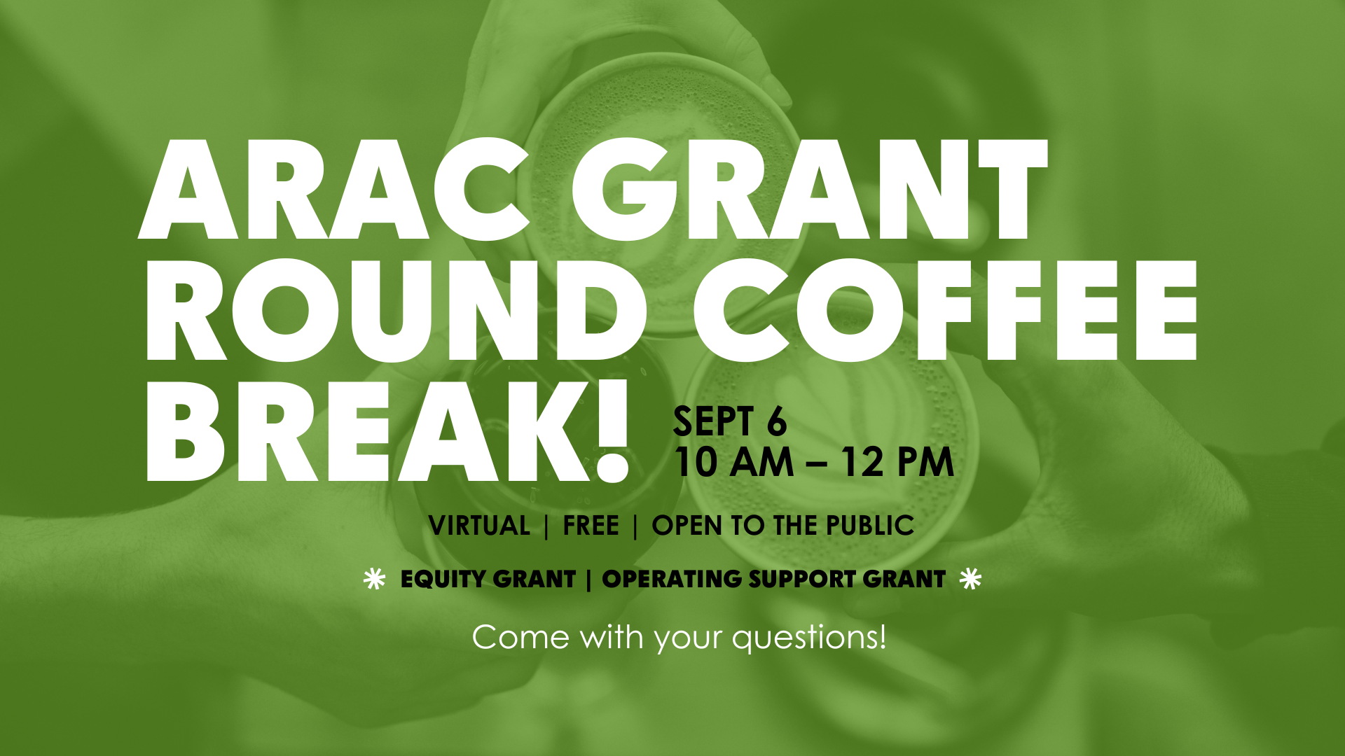 Join ARAC's Grant Advising Team for an informal opportunity to connect with ARAC Staff during a Coffee Break Q&A on Saturday, September 6, from 10:00 am - 12:00 pm. Last call for final questions before the September 14, 2025Artist Equity and Operating Support Grant application deadline!